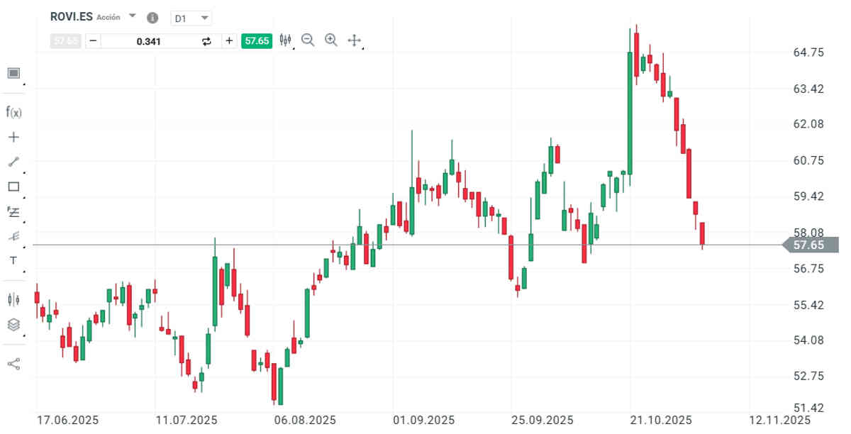 Rovi viene mostrando debilidad en Bolsa por la caída en su segmento CDMO (fabricación a terceros), cuyo volumen de ventas bajó un 35% en el último informe semestral. Esto ha impactado negativamente en sus márgenes y en el beneficio neto, que también retrocedió más de un 10% en la primera mitad del año respecto a 2024. Esta presión operativa arrastra la cotización, que a pesar de recuperar parte del terreno en octubre por acuerdos estratégicos como el firmado con Roche, vuelve a corregir hoy por la falta de sorpresas positivas y por las dudas sobre la evolución del negocio menos rentable.