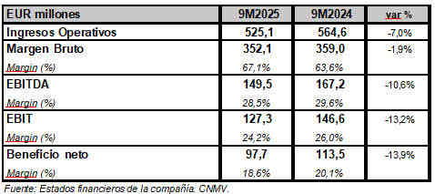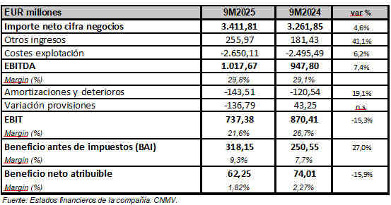 Finalmente, el beneficio neto se contrajo un 13,9% interanual en 9M2025 hasta los EUR 97,7 millones, desde los EUR 113,5 millones en el mismo periodo de 2024.
