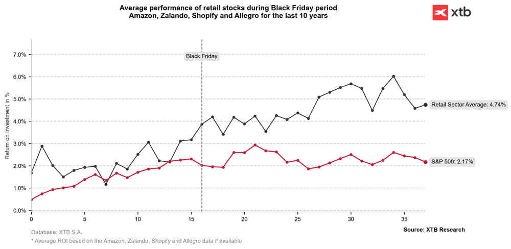 El Black Friday es mucho más que un día de promociones: marca el inicio simbólico del periodo más lucrativo para los minoristas globales, especialmente para las plataformas de comercio electrónico. Si bien no todas las marcas experimentarán el mismo aumento en las ventas (todo depende de la combinación de productos y las preferencias de los consumidores), una cosa es segura: el gasto en línea sigue creciendo y el comercio electrónico continúa prosperando, independientemente de los cambios en el comportamiento del consumidor. Por eso, esta época del año suele impulsar notablemente las acciones de empresas como Amazon, Shopify, Zalando o Allegro.