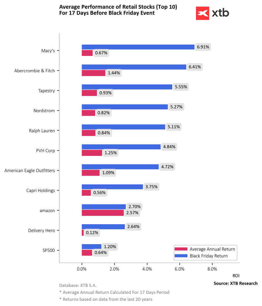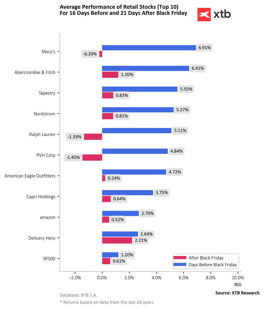 Durante los últimos 20 años, las acciones del sector minorista han superado consistentemente el rendimiento del principal índice bursátil, especialmente en los 17 días previos al Black Friday. Los modelos de negocio de minoristas como Macy’s o Tapestry Inc. hacen que se beneficien más de una buena temporada de ventas en el cuarto trimestre que del propio evento de un solo día. Sin embargo, el Black Friday sigue marcando un límite estacional clave.