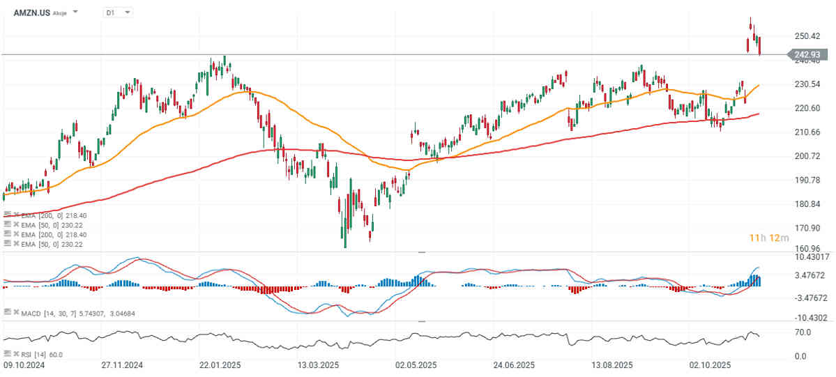 Desde un punto de vista técnico, el precio de las acciones de Amazon ha retrocedido desde sus máximos históricos y ahora está probando la zona de ruptura posterior a la publicación de resultados, cerca de los 242 dólares, que coincide con el pico de enero de 2025.