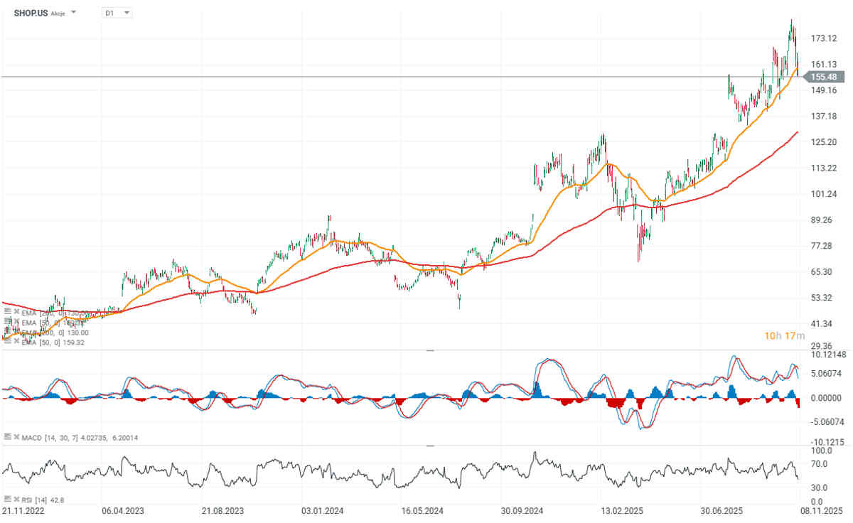 Las acciones de Shopify han experimentado una ligera baja recientemente, retrocediendo cerca de un 10% desde sus máximos históricos, aunque siguen respetando la tendencia alcista general. La compañía continúa siendo un pilar fundamental del ecosistema global del comercio electrónico, impulsando millones de tiendas online, y la estacionalidad podría reactivar el interés de compra justo cuando el precio se acerca al soporte de la línea de tendencia inferior.
