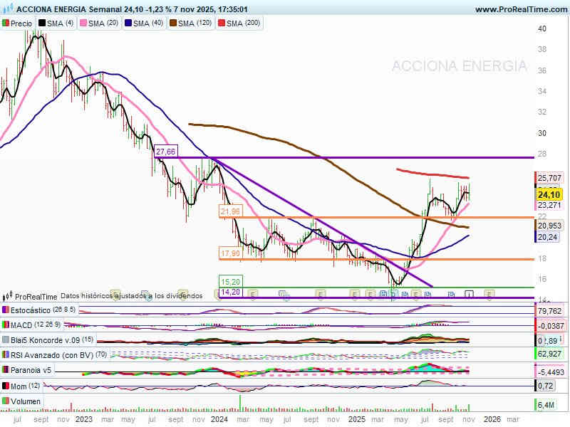El valor se mueve estas últimas semanas entre ambos valores. Resistencia: la encontramos en 25,70€. Soportes: los 21,90€, los 20€ y los 17,90€.