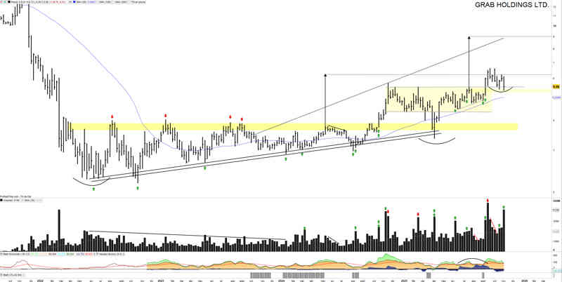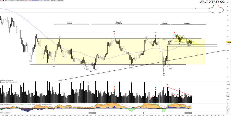 El gráfico es bonito la verdad, se comprime en cuña descendente entendida como patrón de continuidad, mientras el volumen disminuye. Lo hace sobre media de 50 semanas.
