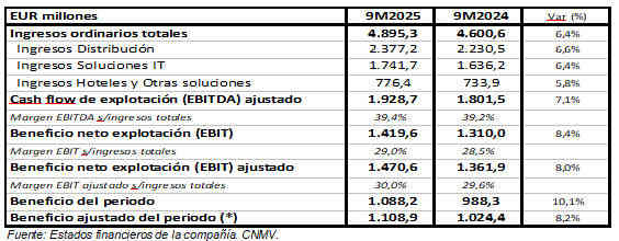 . AMADEUS (AMS) presentó el pasado viernes sus resultados correspondientes a los nueve primeros meses del ejercicio (9M2025), de los que destacamos los siguientes aspectos: