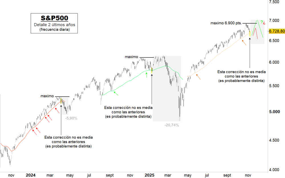 El pasado viernes, el índice SP500 marcó una pauta de vuelta desde los mínimos en 6.631 puntos hasta los 6.728 puntos en los que cerró la sesión, prácticamente en los máximos de esta. Desde los máximos del pasado 29 de octubre el selectivo acumuló un drawdown del -4,17%, transgrediendo el paso de la media móvil que sostenía las correcciones desde el mes de junio.