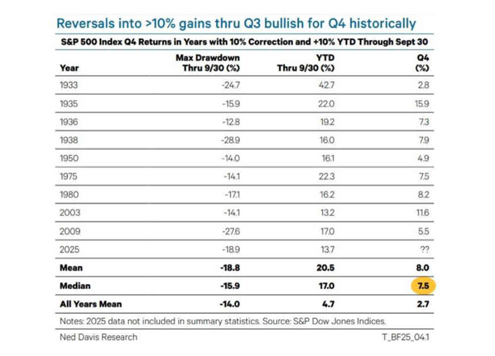 En este sentido, en los últimos 100 años, cuando el SP500 ha remontado fuertes caídas durante el año para situarse con rentabilidades superiores al 10% a cierre del 3T, el 4T ha venido siendo positivo en el 100% de las ocasiones. Si tenemos en cuenta que el cierre del SP500 en el 3T fue en 6.688 puntos, toda corrección por debajo de esta cota sería, en base a estos datos, una oportunidad de compra.