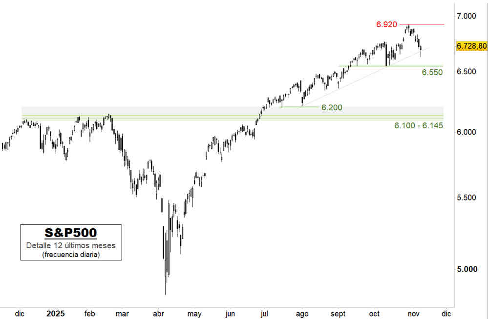 Este dato sugiere la posibilidad de que el SP500 pueda profundizar las correcciones iniciadas en los máximos de octubre (6.920 puntos), pese a que pueda darse un rebote en el corto plazo, que incluso pueda volver a la zona de máximos expuesta.
