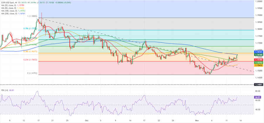 En el gráfico de 4 horas, el EURUSD cotiza en 1.1616, registrando ganancias marginales en el día. Las Medias Móviles Simples (SMA) apuntan a un tono más firme, con la SMA de 20 períodos por encima de la de 100 períodos, mientras que la de 50 períodos también se inclina al alza. El precio se mantiene por encima de las SMAs de 20, 50 y 100, aunque la SMA de 200 períodos, que desciende suavemente, aún limita el alza. El Índice de Fuerza Relativa (RSI) en 66.8 se fortalece, acercándose a condiciones de sobrecompra y reforzando el impulso alcista.