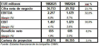 ACS obtuvo en 9M2025 un beneficio neto atribuible de EUR 655 millones, lo que supone un incremento del 8,3% respecto al mismo periodo del año anterior, un 11,6% al ajustarse por el efecto del tipo de cambio.
