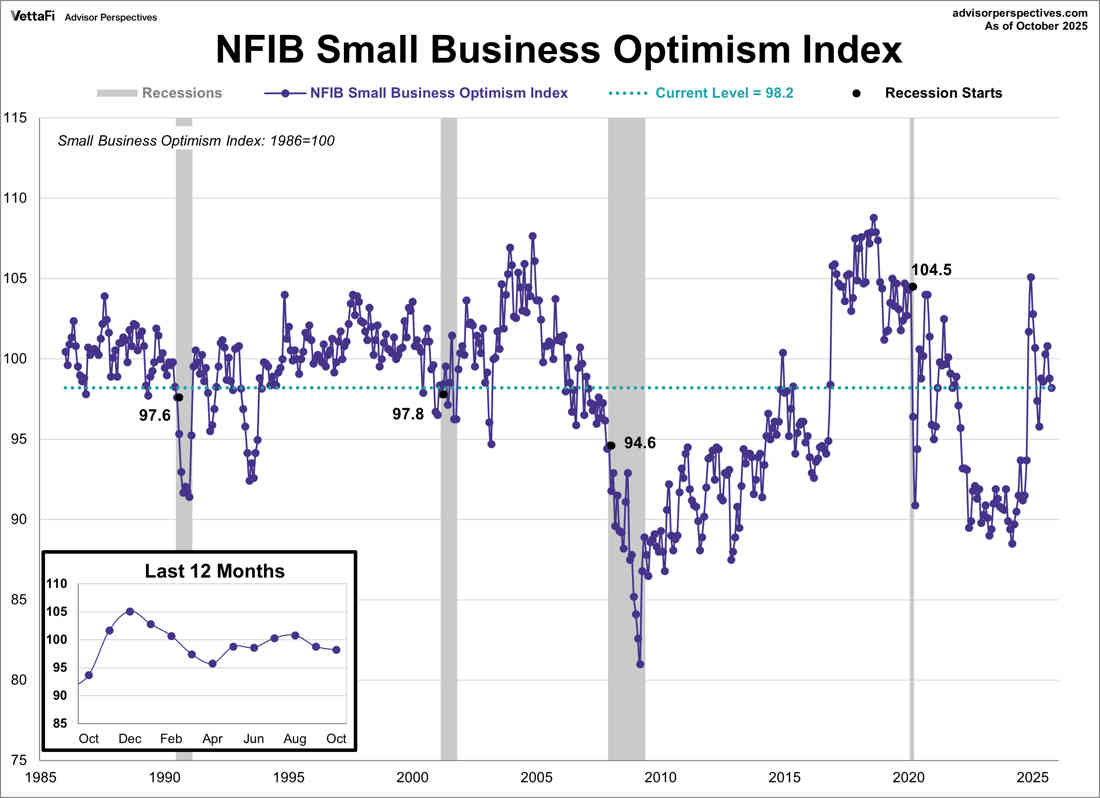 La confianza se ha ido deteriorando y, según la última encuesta de NFIB, ha vuelto a caer en octubre, un dato peor de lo esperado por los expertos que además se encuentra por debajo del nivel 100. Un nivel a vigilar desde que en los últimos 40 años las recesiones económicas se han producido con este indicador por debajo del nivel 100.