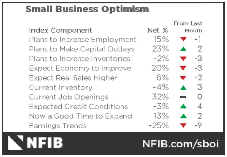 El desglose de los 10 componentes del índice de sentimiento NFIB respecto a la encuesta de hace un mes muestra caída de 5, mejora de 4 y uno sin cambios.
