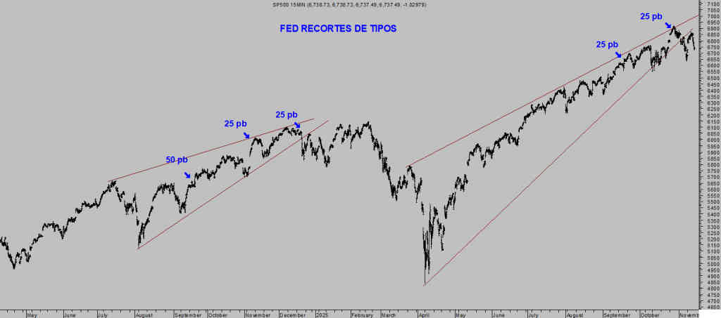 Sin embargo, las múltiples declaraciones de distintos miembros del FOMC, en distintas ocasiones poniendo en duda una rebaja de tipos en diciembre, y el hecho de que ayer no se hiciera público el dato de IPC de octubre y de los comentarios de la Sra Leavitt, han provocado una reacción nerviosa de los mercados e inversores.