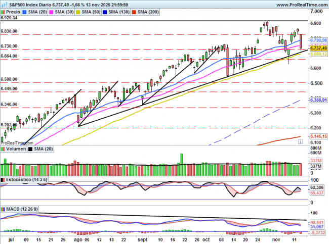 Si el mercado aguanta por encima de 6730 es probable que vuelva a rebotar , siendo nuevamente la zona de 6870/6920 el principal objetivo.