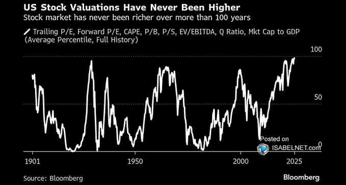 Las valoraciones de hoy son las más altas registradas desde el año 1900!. El gráfico siguiente recoge la evolución de las valoraciones medias del mercado contemplando los ratios más seguidos por los analistas (PER, PER previsto, CAPE (PER medio de 10 años ajustado por inflación), ratio Precio/valor en Libros, Precio /Ventas, Precio/EBITDA, Q Ratio (valor a coste de reposición de activos) y relación entre la capitalización del mercado y el PIB (Buffett ratio).