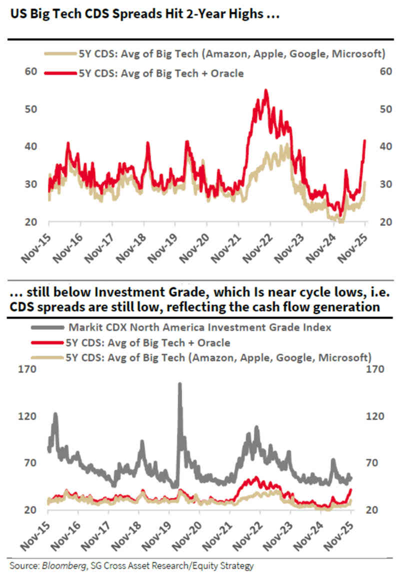 Los Credit Default Swaps o seguros de impago -CDS- están subiendo con fuerza, Oracle liderando la subida. Después de haber alcanzado mínimos de ciclo hace unos meses, el agregado de los CDS de las grandes tecnológicas ha alcanzado máximos de más de 2 años.