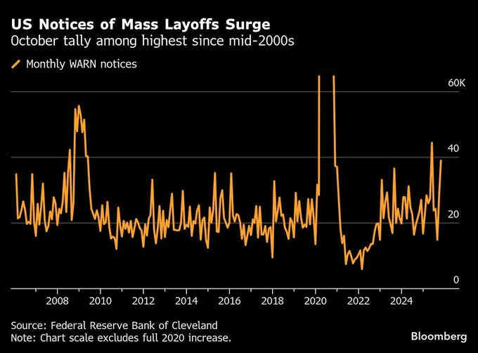 Los anuncios de despido inminentes se han disparado en octubre hasta 39.000, según los datos de la Reserva Federal de Cleveland, solo hemos visto un número mayor de advertencias en 2008, 2009, 2020 y en mayo de 2025.