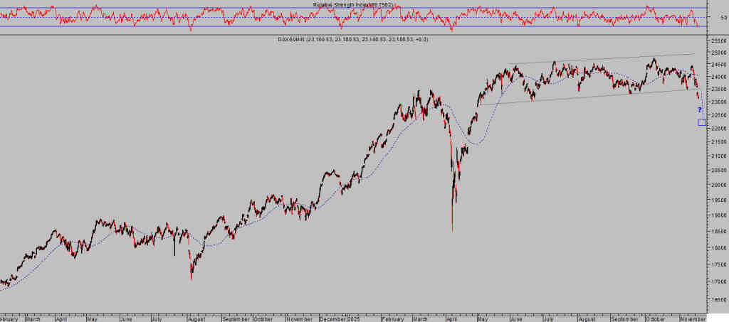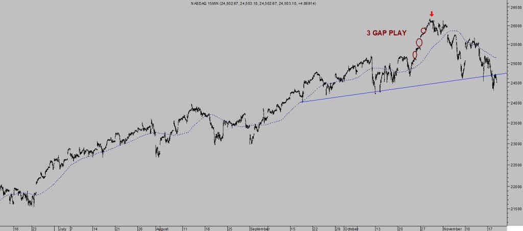 Ayer las bolsas continuaron goteando a la baja y cerraron en rojo por cuarta sesión consecutiva. El techo alcanzado el pasado 29 de octubre fue muy acertadamente telegrafiado por un cásico patrón técnico que suele advertir proximidad a techo y giro inminente, el famoso «3 Gap Play» aquí explicado el mismo día 29 de octubre.