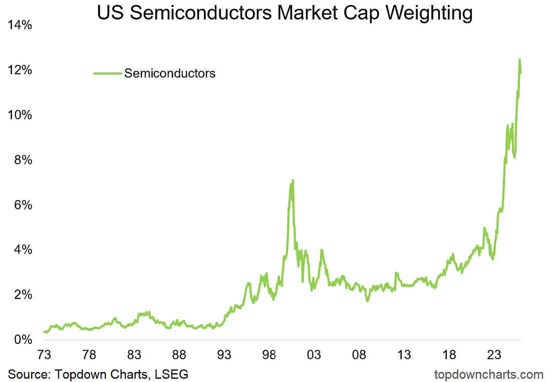 Las bolsas dependen del comportamiento del sector tecnológico y más concretamente del subsector relacionado con la IA y los semiconductores. El sector semiconductores representa un porcentaje sobre el total del mercado del 13%, tras haber multiplicado por más de 3 veces en sólo 30 meses.