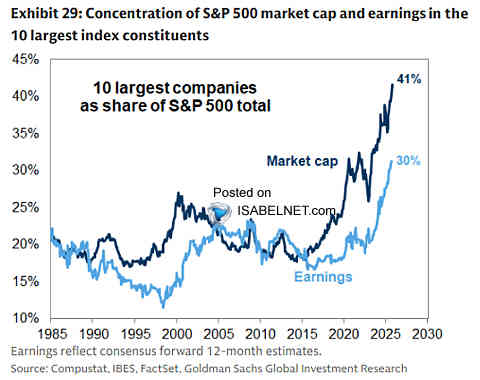 La concentración de poder de esas 10 empresas (el 2% de las 500 del SP500) es histórica y alcanza el 41% pero su aportación a los beneficios totales del índice es de sólo el 30%