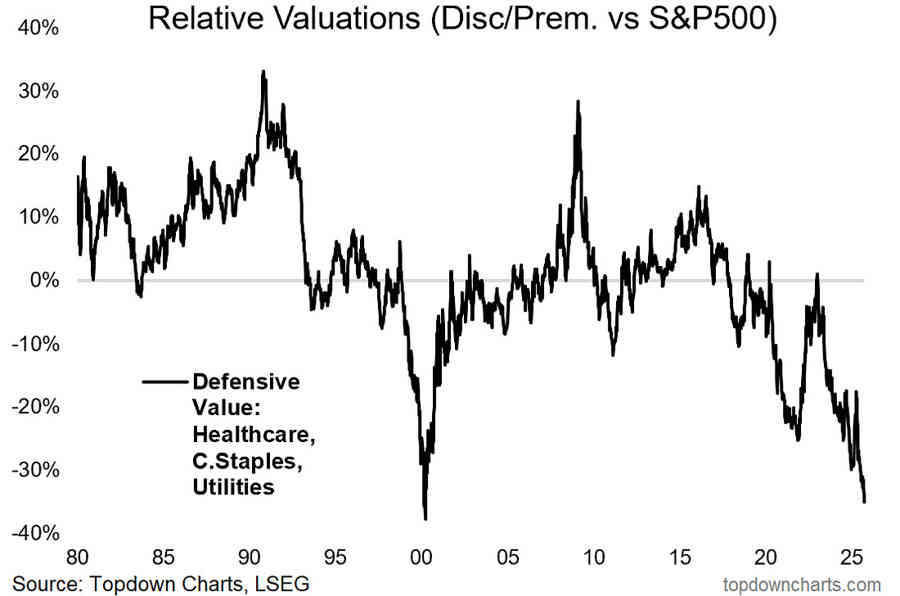 El indicador de valor relativo de los sectores defensivos (sectores de salud, servicios públicos y consumo básico) respecto al del SP500 se está acercando al profundo descuento que alcanzó cuando el mercado estaba finalizando la tendencia alcista masiva que finalizó con el pico de la burbuja puntocom en marzo de 2000.
