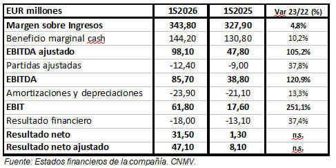 El beneficio neto ajustado alcanzó los EUR 47,1 millones, un aumento notable frente a los EUR 8,1 millones registrados en el 1S2025.