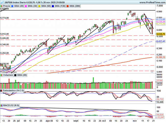Desde ahí el mercado ha corregido con fuerza hasta cerrar en 6538 prácticamente mínimos del día y cerca del GAP alcista y soporte clave de 6512 puntos, zona desde la que lleva rebotando desde septiembre.