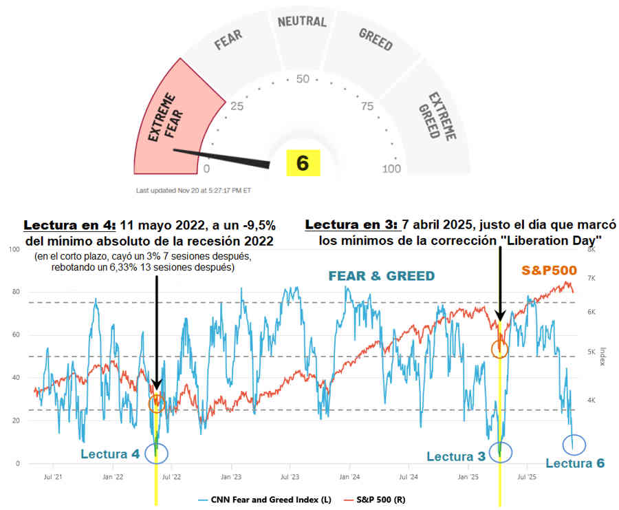 El pasado 7 de abril se registró una lectura de 3 el mismo día en que se marcó el mínimo de la corrección del Liberation Day. Con lecturas ayer de 6, esperar una caída adicional en el corto plazo del 4-6% parece complicado, y si se da, sin duda sería una gran oportunidad.