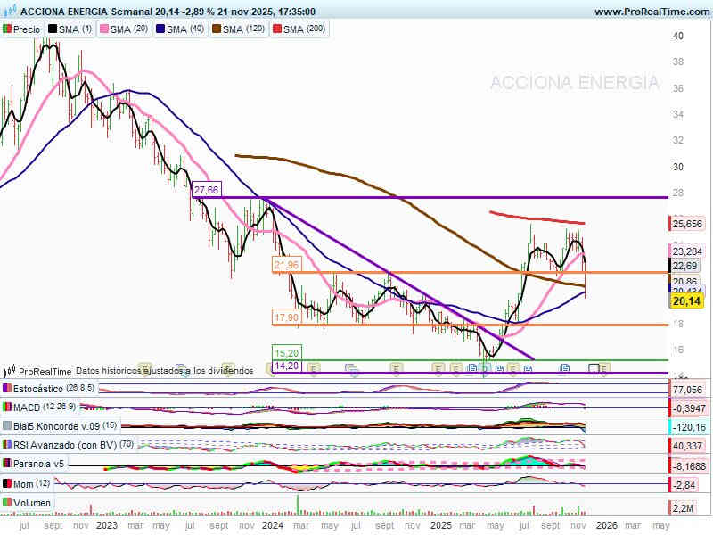 Soportes: niveles de los 20€ que es donde confluye la SMA120 con SMA40 y los 17,90€.