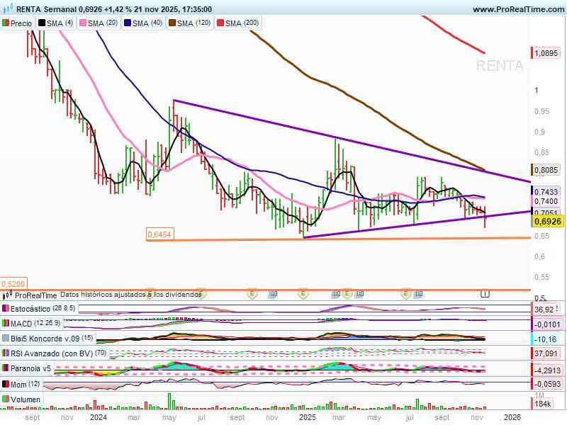 La pérdida de dicho soporte podría dar lugar a la visita de la siguiente zona de soporte situada en las inmediaciones de los 0,65€. Sin interés hasta superar los 0,85€.