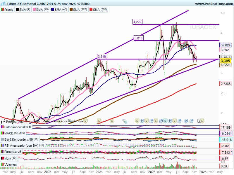 Sin descartar realizar nuevamente visita a la directriz alcista de l/p, por donde pasa la SMA 120 sesiones. Clave no perder los 3,20€.