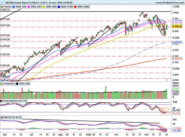 En la jornada de este lunes el SP500 conseguía superar con claridad el máximo del viernes y antigua resistencia situada en 6774 puntos, lo que le ha permitido recuperar el nivel de 6700 puntos.