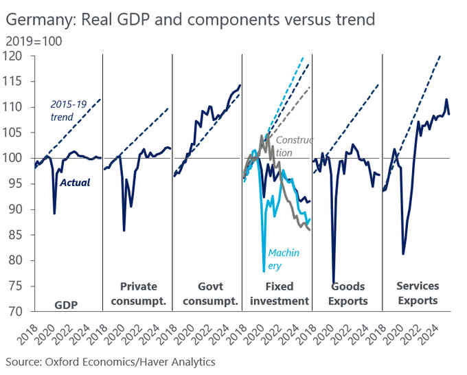 Tanto el PIB de Alemania como todos sus componentes están estancados desde hace años y situados bien por debajo de su tendencia, particularmente la inversión.