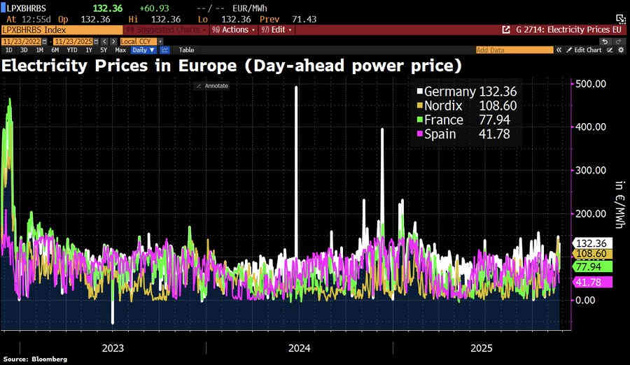 El MWh (MegaWatio/hora) cuesta €132 en Alemania, muy por encima de los €78 de Francia o €41.8 de España.