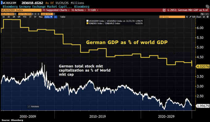 De igual forma que la economía pierde cuota en el mundo, su mercado de valores, medido a través del índice selectivo DAX-40, llegó a suponer algo más del 4% de la capitalización de las bolsas globales en 2007 pero hoy después de 3 lustros de caída está ligeramente por debajo del 2%.