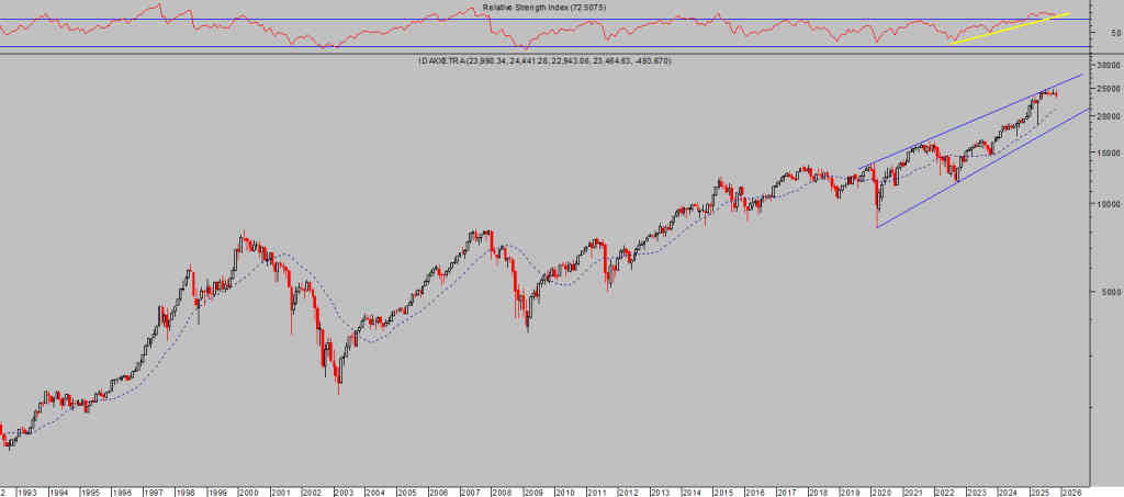 El DAX alemán cotiza en zona de máximos históricos, ha subido alegremente durante años junto con las bolsas globales en una tendencia alcista de largo plazo sincronizada y liderada por la bolsa americana que, con mucha mayor fuerza, se ha distanciado del resto de forma impresionante.
