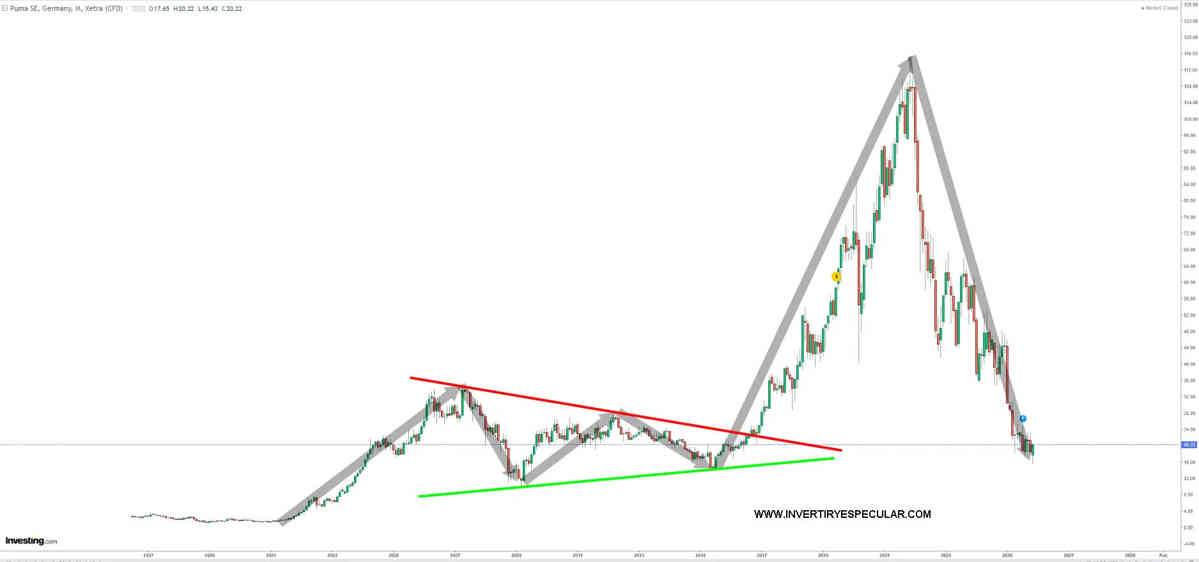 PUMA esta semana cotizaba en mínimos no vistos desde 2008 y 2015, así que los chinos pueden negociar a placer con la empresa alemana y esto todo un aviso para las demás que con gran solera de mercado están en mínimos (o cerca) históricos.