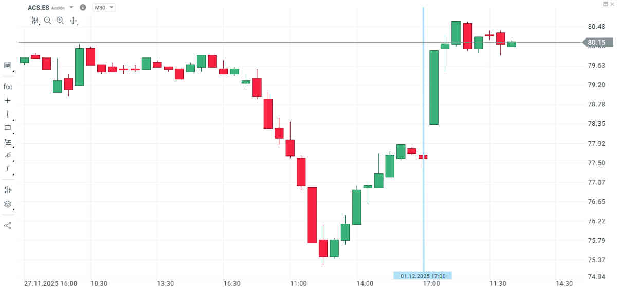Las acciones de ACS suben un 2,77% en estos momentos, lo que contribuye a una revalorización que alcanza el 65% durante el 2025.
