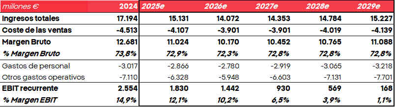 En el informe completo el lector puede ver los comentarios sobre la situación financiera de la compañía, ya que su endeudamiento se ha incrementado de manera importante. Más allá de eso, en nuestro escenario base asumimos que el 2026 será un año de transición en el que el cierre de tiendas afectará a los ingresos. En el 2027 ya esperamos un repunte del sector y consigo de Kering, que debería hacerlo mejor por una base comparativa más baja y por las medidas que se están llevando a cabo.