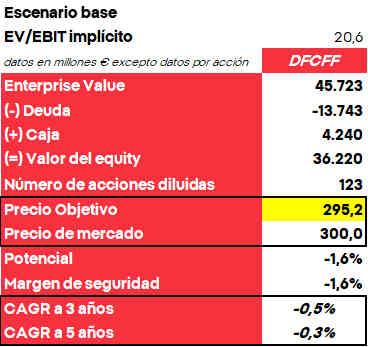 Además, asumimos una tasa de descuento del 10%, debido al riesgo que consideramos que tiene la inversión y la falta de visibilidad sobre los futuros ingresos. Con todo ello, nuestro descuento de flujos de caja nos da un precio objetivo de 295,2€ por acción, por lo que estaríamos hablando de una compañía que ya estaría en precio. Consideramos que los contras superan a los pros y si bien deberíamos estar atentos a esta firma, de momento creemos que es mejor ser cautos y esperar antes de tomar acción.