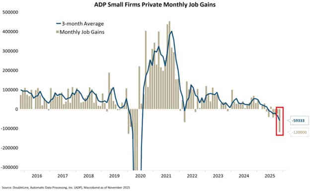 Las pequeñas empresas USA también están despidiendo trabajadores y a un ritmo impactante, según el informe de empleo reciente de APD, han recortado alrededor de 120.000 empleos en noviembre en la mayor oleada de despidos desde mayo 2020, (en plena pandemia) y encadenando 6 meses de destrucción de empleo de los últimos 7. En ese periodo las pequeñas empresas han reducido en 264.000 trabajadores sus plantillas.