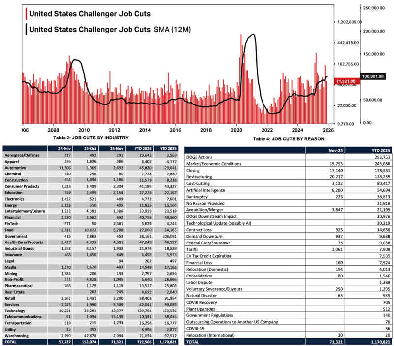 Challenger Grey publicó ayer su informe de empleo de noviembre. Las empresas (empleadores) anunciaron 71.000 despidos en noviembre (frente a 57.000 de hace un año y 153.000 de octubre) y, por otra parte, los planes de contratación han sido los más bajos en tres meses, con sólo 9.000.