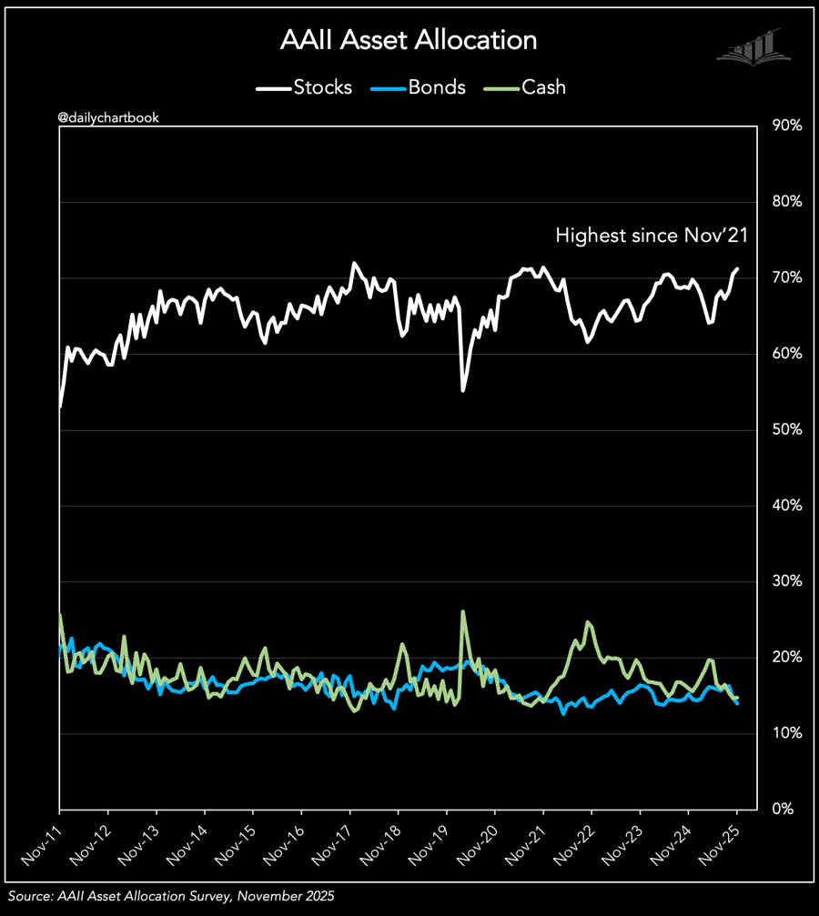 La asignación de activos de los pequeños inversores según el AAII (Asociación Americana de Inversores Individuales) aumentó en noviembre hasta el 71.2% el nivel más elevado desde noviembre 2022, mientras que la posición en efectivo cayó hasta el 14.8% o nivel mínimo en 4 años.