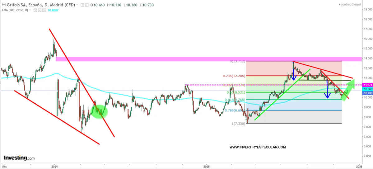 Ahora Grifols tiene pagada su penitencia técnica por fallar al alza y encima con el agravante de estar en un Ibex en máximos históricos, vamos que fue contra él y no con él. A cierre de ayer confirmó la rotura de bajista acelerada de máximos de octubre y parece que quiere ir a por la EMA 200, la resistencia anterior y el pullback al soporte de la figura rota.