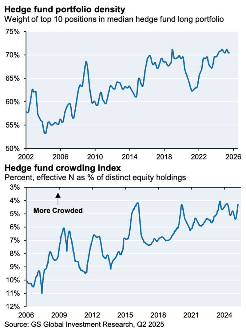 De media, las 10 primeras posiciones de cartera de los Hedge Funds suponen más de un 70% del total de sus inversiones, merodeando niveles máximos históricos.