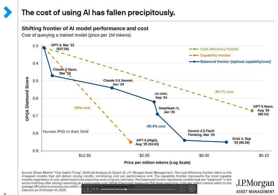 Y para colmo de males, el coste de usar modelos de IA se está desplomando, según apuntan analistas de JP Morgan.