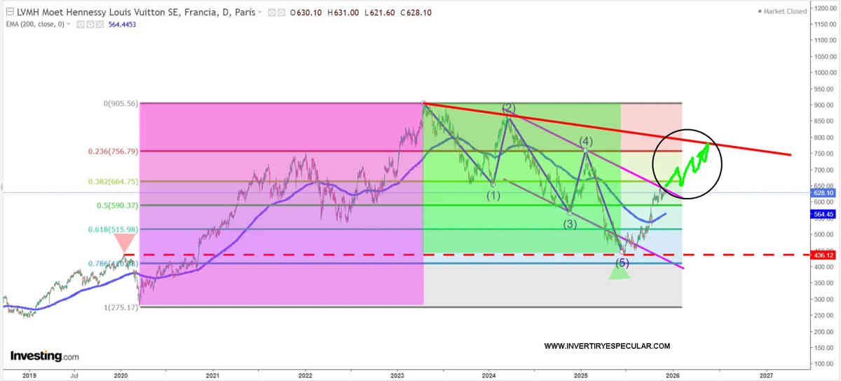 Para nosotros LVMH ha purgado su penitencia técnica en una clara corrección en cinco atras el impulso alcista 275 – 905 euros , la corrección se apoyó justo en los niveles pre-covid lo que nos da una muy buena sensación técnica, ha superado el tercero bajista y creemos que debería a por el cuarto bajita y la bajista de máximos lo que supondría una rentabilidad