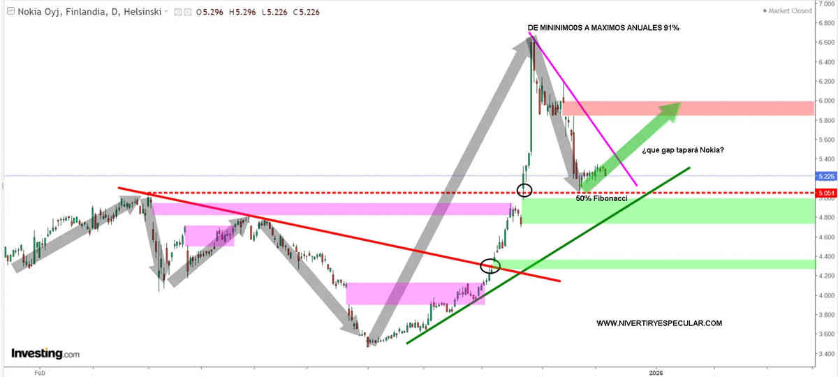Para nosotros NOKIA si es mas compleja porgue parece una montaña rusa y no tiene un orden técnico ordenado y predecible dado que no es una serie alcista ni de fondo ni de forma amos. Un ejemplo lo tenemos este año que de mínimos a máximo anuales casi se dobla para luego perder la mitad de lo subido. La oportunidad se la vemos si de los dos gaps que tiene por tapar se va a por en de 5.8-6 euros porque si es el de 5-4.8 euros más que una oportunidad sería una amenaza, pero aún así tendría el beneficio de la duda.