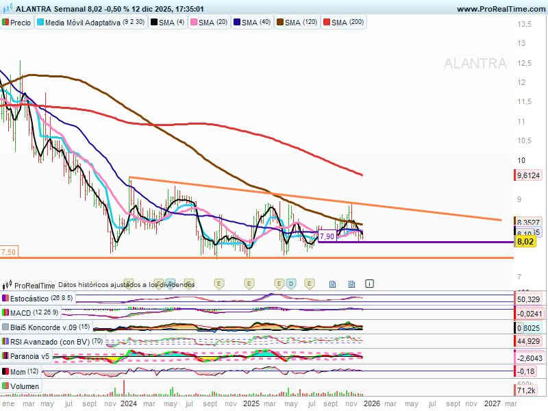 En velas semanales continúa en movimiento lateral, entre zona de resistencia de 9,00€ aproximadamente y la zona de soporte o mínimos de 7,68€.