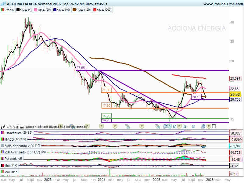 Resistencia: la encontramos en 21,90 y 25,70€. Soportes: niveles de los 20€ que es donde confluye la SMA120 con SMA40 sesiones y los 17,90€.